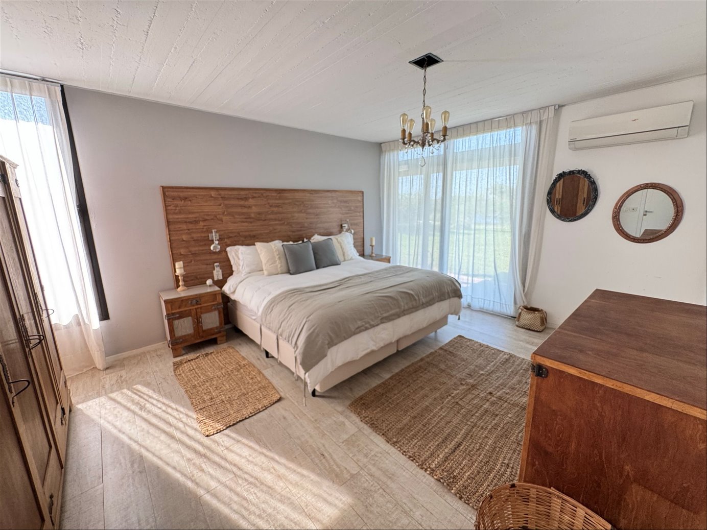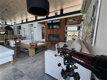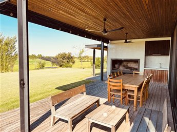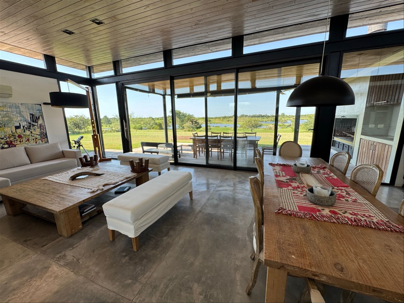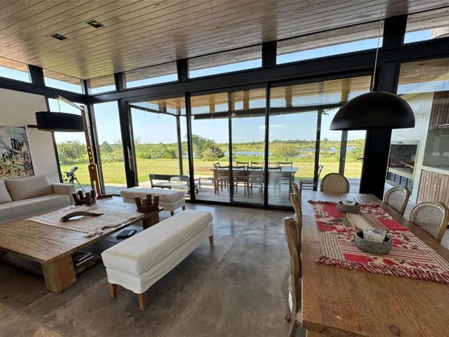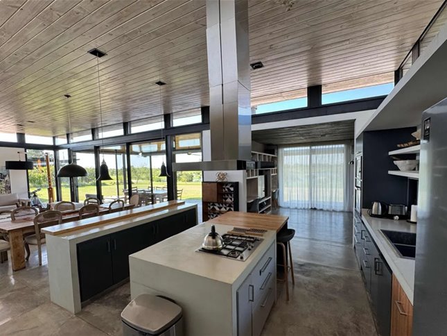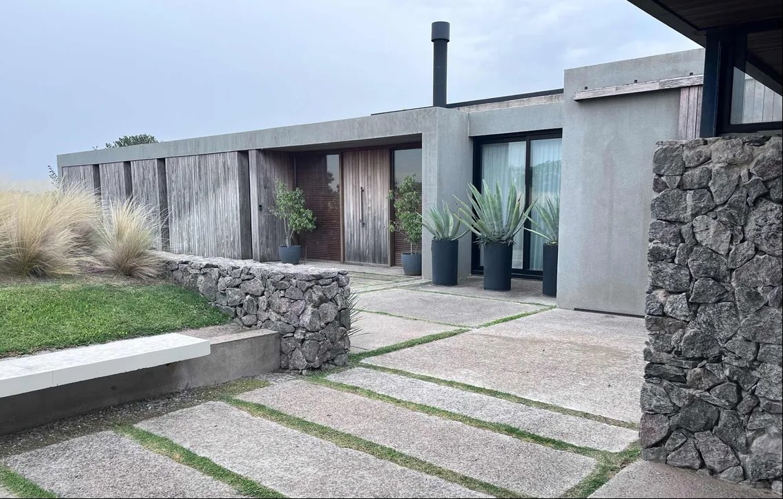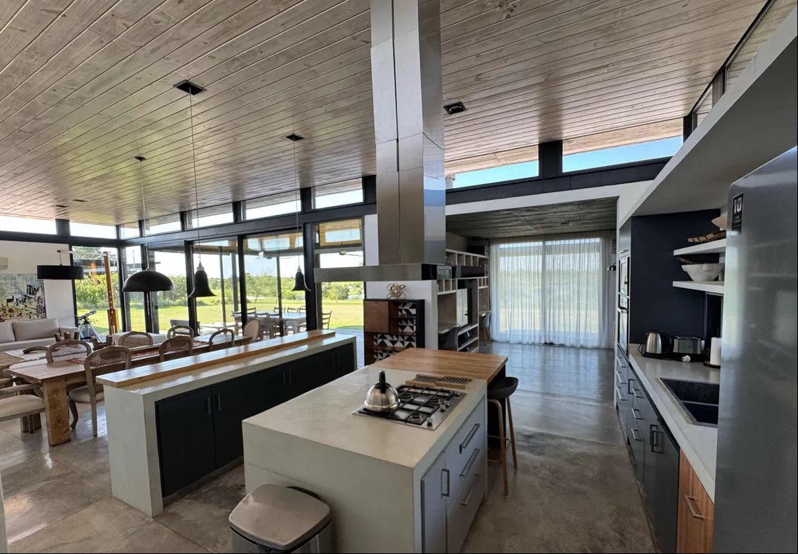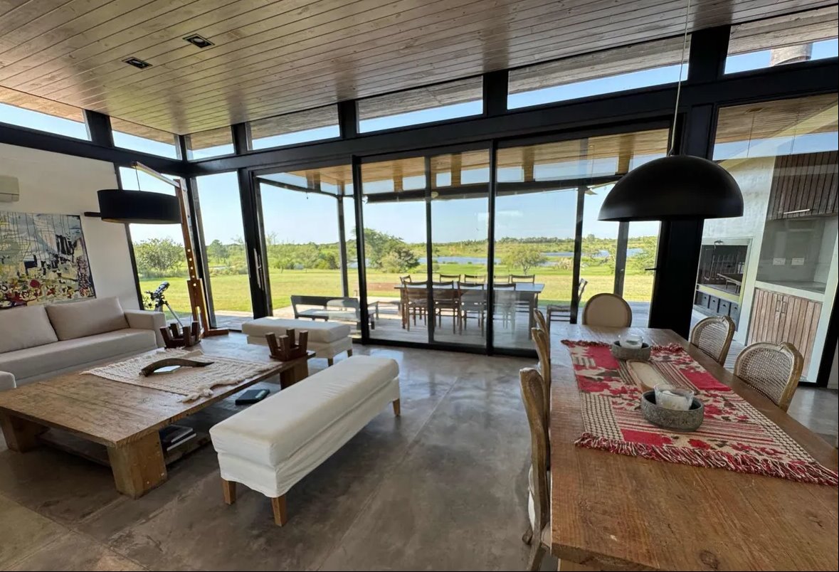 Diseñada por reconocidos arquitectos argentinos y construida hace apenas 8 años, combina materiales nobles como cemento, madera dura y piedra, logrando una estética moderna, cálida y perfectamente integrada al paisaje. Los espacios interiores son amplios, con techos altos y grandes ventanales que inundan de luz cada rincón, y conectan de manera fluida el interior con la galería exterior y el verde del jardín.